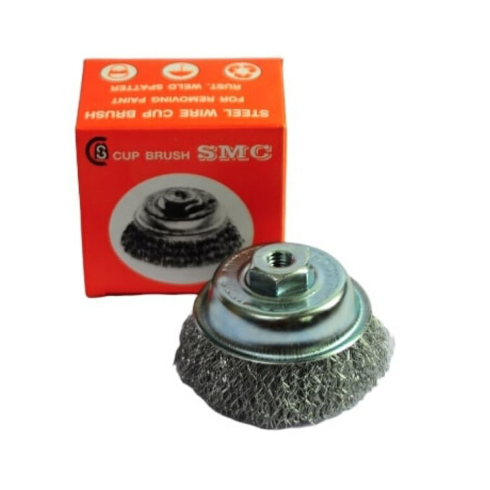 แปรงลวดรูปถ้วย SMC 5 1/2x10x1.5  อุปกรณ์สำหรับเตรียมพื้นผิวสำหรับงานเชื่อม งานลบคลีบ กำจัดคราบสนิมสำหรับงานอู่ต่อเรือ ถังน้ำมัน และทำความสะอาดลอกสีพื้นผิวก่อนทาสี กำจัดกาว และสิ่งสกปรกต่างๆ ขนแปรงไม่หลุดง่าย ทนทาน ต่อการใช้งาน มีความยืดหยุ่นให้ตัว ทำให้แปรงมีประสิทธิภาพในการขัดและซอกซอนเข้าไปในซอมมุมเล็กได้ดี